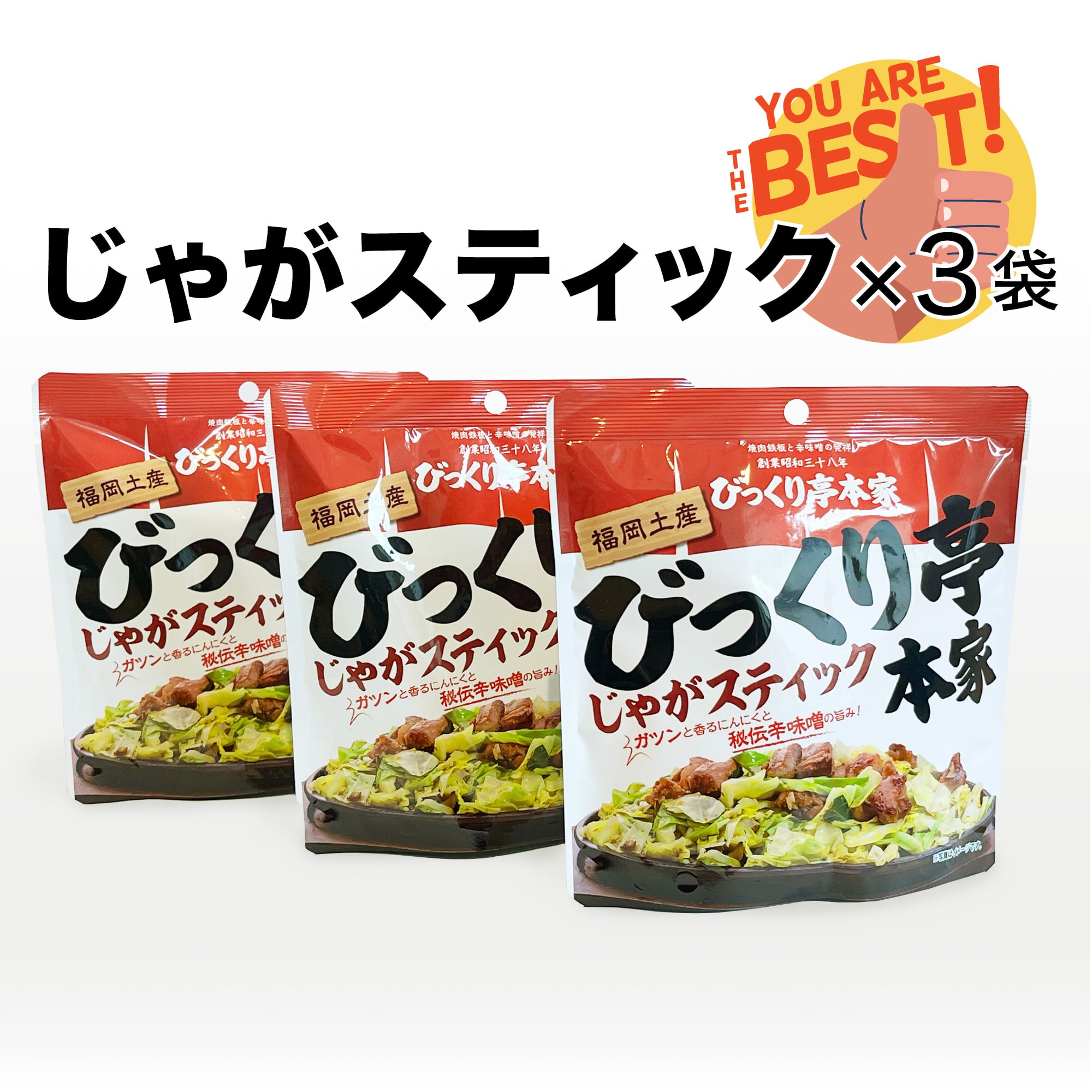 創業60年を超える福岡のソウルフード「びっくり亭本家」の名物・鉄板焼肉の“ガツンと旨い”味わいを、手軽に楽しめるスナックとして再現しました。 にんにくの効いた秘伝のタレと、びっくり亭本家の象徴である辛味噌のほどよい辛さがあとを引き、鉄板で焼き上げ たような香ばしさと合わさって“あの味”がしっかり感じられます。 濃厚でパンチのある味わいは、おやつにはもちろん、ちょっと疲れた時のおつまみや、ビールやハイボールにもぴっ たり。ひと口で、びっくり亭の世界が広がります。