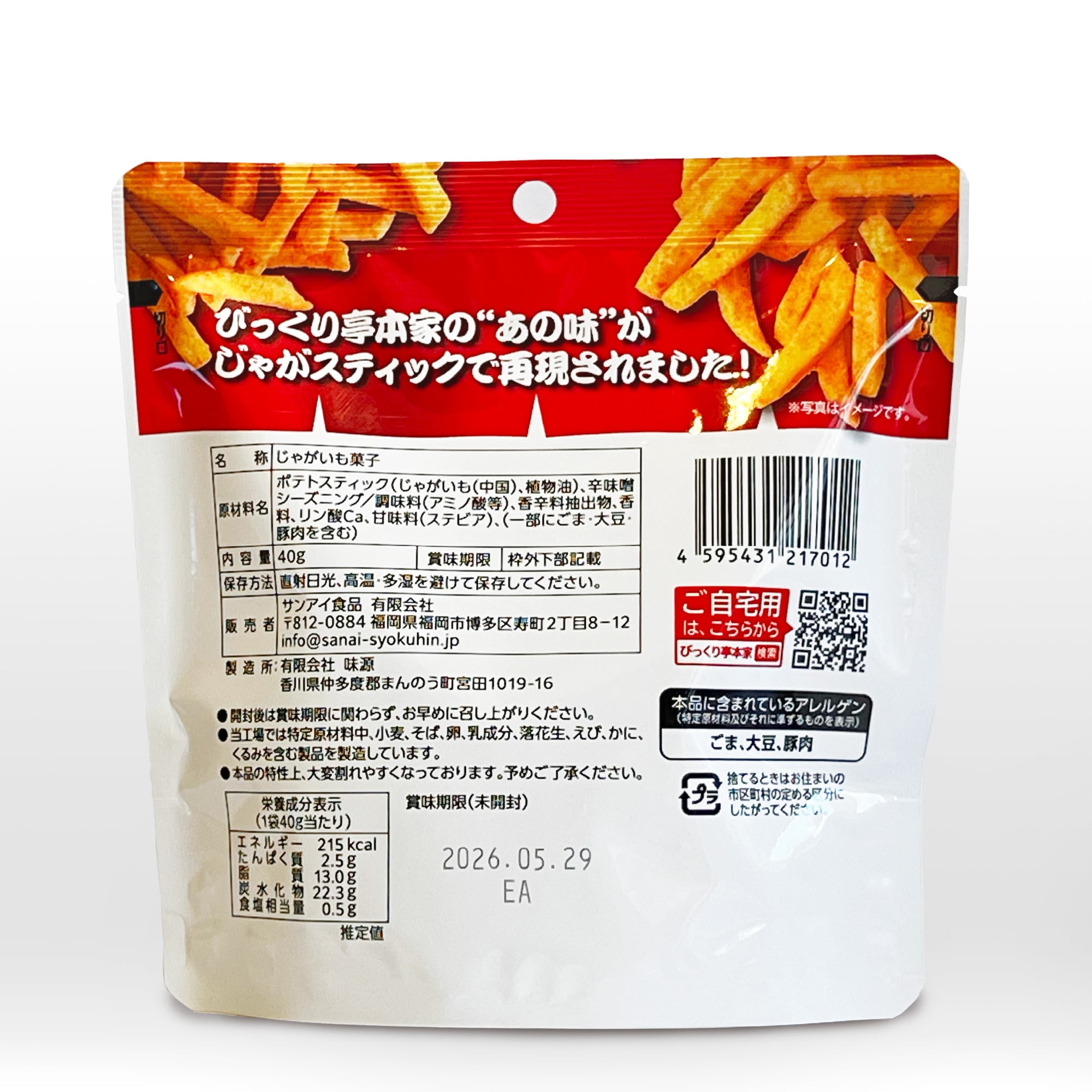 創業60年を超える福岡のソウルフード「びっくり亭本家」の名物・鉄板焼肉の“ガツンと旨い”味わいを、手軽に楽し めるスナックとして再現しました。 にんにくの効いた秘伝のタレと、びっくり亭本家の象徴である辛味噌のほどよい辛さがあとを引き、鉄板で焼き上げたような香ばしさと合わさって“あの味”がしっかり感じられます。 濃厚でパンチのある味わいは、おやつにはもちろん、ちょっと疲れた時のおつまみや、ビールやハイボールにもぴったり。ひと口で、びっくり亭の世界が広がります。